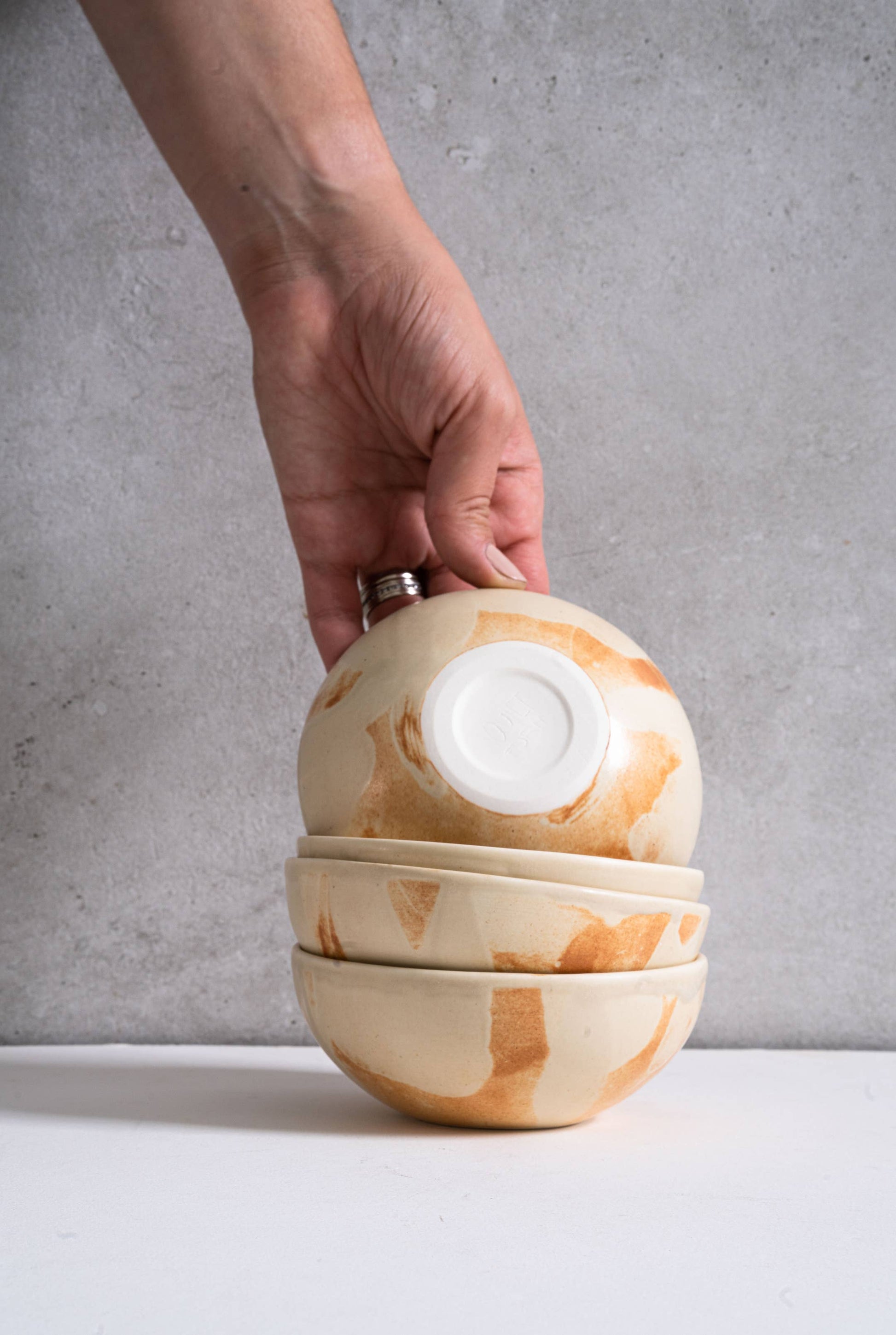 This is the most honest ceramicware we have ever produced - exposed rough stoneware shows occasional signs of the artisans' fingers that were left during the hand-throwing process. The sides were smoothed but one can still see stoneware pores as if the dinnerware is breathing. The inside is covered with an opaque white glaze for convenient use. This bowl is perfect for soups, ramen, breakfast bowls, pasta, salads, snacks and so many more.