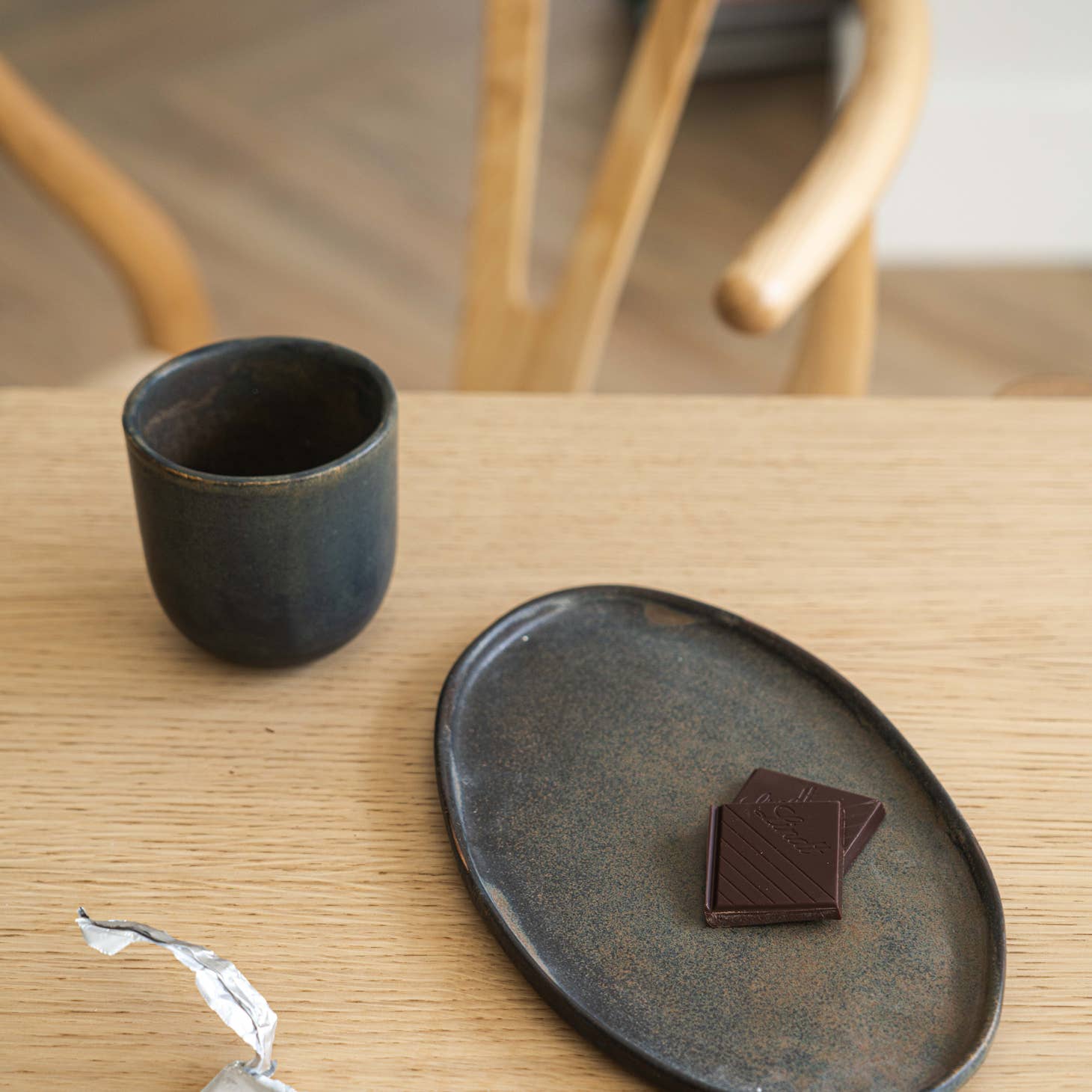 A handmade stoneware serving platter with organic round edges works perfectly for everyday and special occasions alike. The oval shape of this platter makes it easier to set the table. Hand-dipped in a reactive glaze that swirls uniquely across each piece.